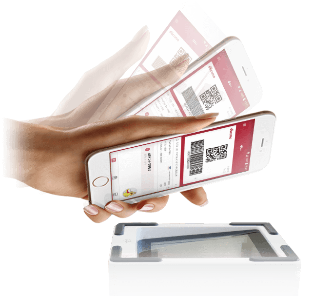 映画館・遊園地でのチケット購入/発券/会員情報の取得に、お客様のスマートフォン等、様々なメディアに表示/印字された1D/2D/QRコードを読み取ります。