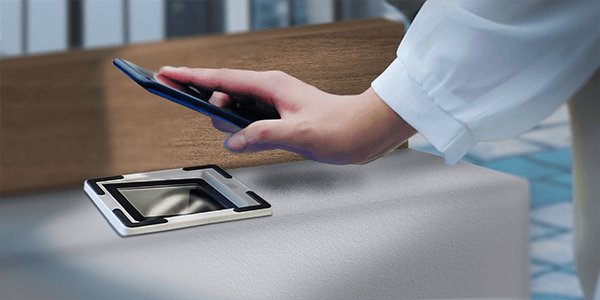 スマートフォン画面に表示されたQRコード/バーコードをかざすだけで読み取る卓上リーダー