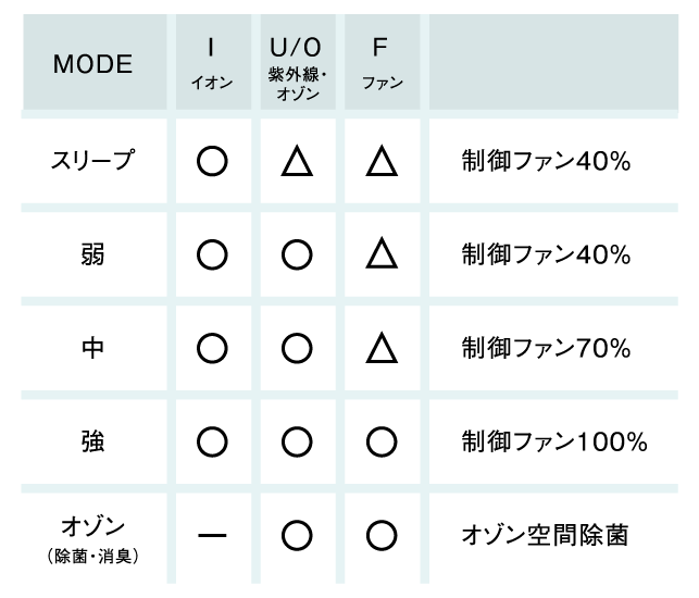 オゾン濃度を最小限にし、ファンの回転数も下げているので、おやすみの時など静かなシーンに最適です。