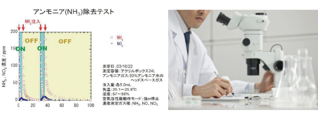 食環境衛生研究所のウイルス不活性化実験に加え、悪臭の原因物質であるアンモニアや硫化水素、エチレンなどの化学物質除去、たばこの悪臭成分除去テストなども行っています。