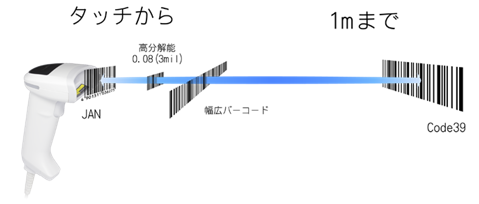新規光学系を採用し、タッチ読み取りから遠方は実力値でエレメント幅1.0mmバーコードを1mまで読み取り可能です。