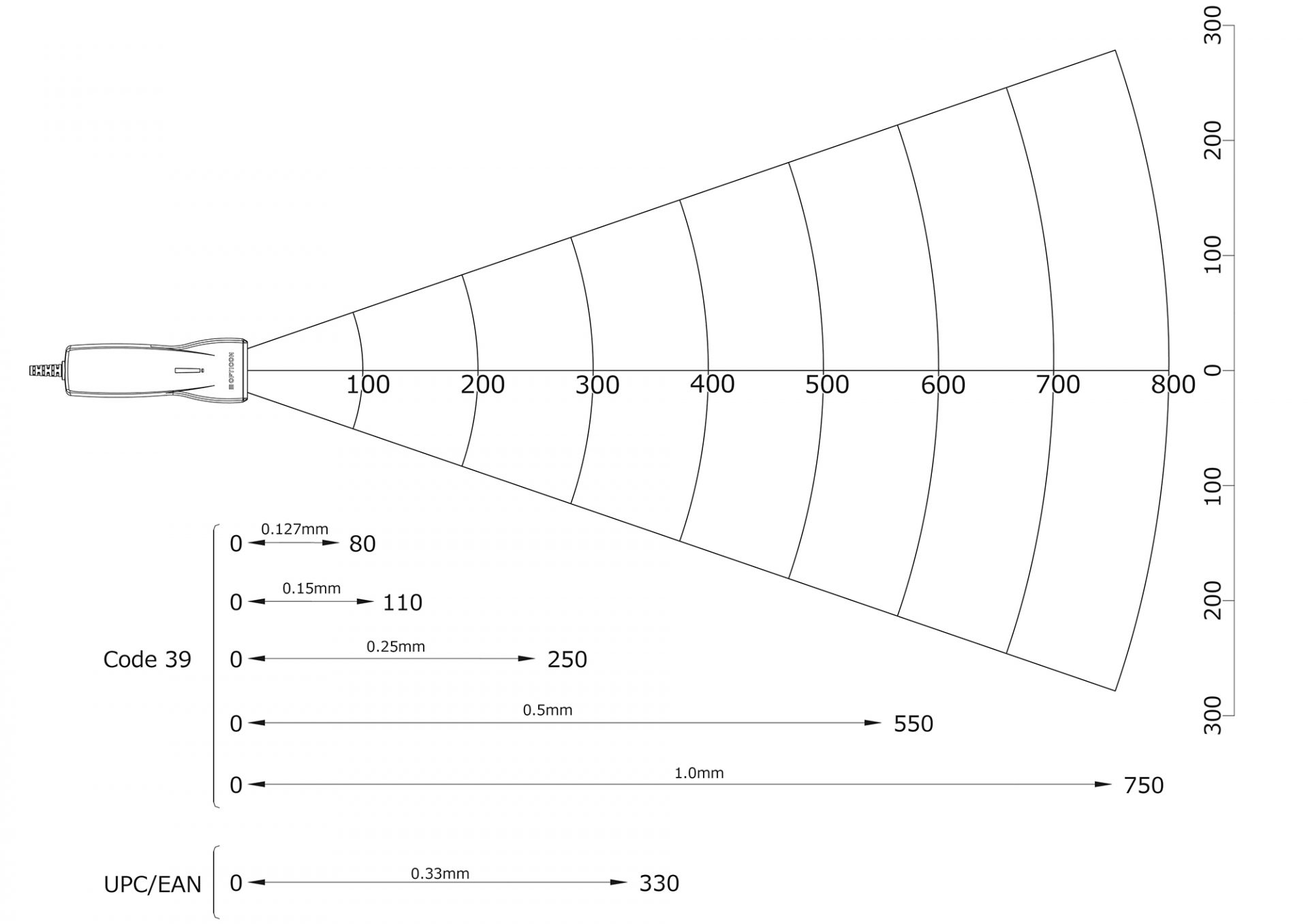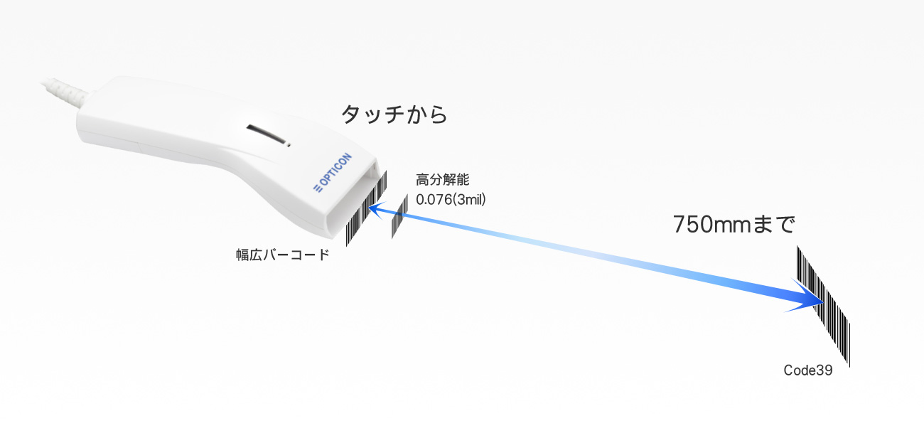 | 幅広バーコード | 110mm (分解能0.2mm Code39) | |