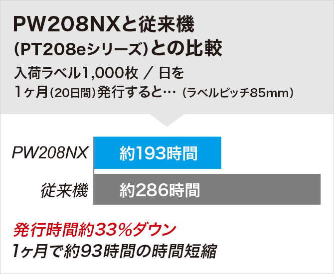 | 自己診断機能 | ヘッド切れチェック、ペーパーエンド検出、ハクリ後ラベル有り無し検出(PW208NXのみ)、バッテリ劣化警告 | ||