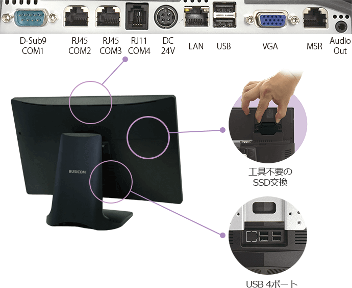 USB 6ポート、シリアル 6ポートがあり、様々な業務用ハードウェアとの接続が可能。