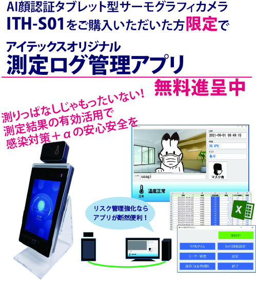 サーモグラフィカメラ単体よりも便利にわかりやすく、リスク管理強化に役立つコロナ対策や入退室管理ができるこの専用アプリを、ITH-S01ご購入の方限定で無料進呈しています。